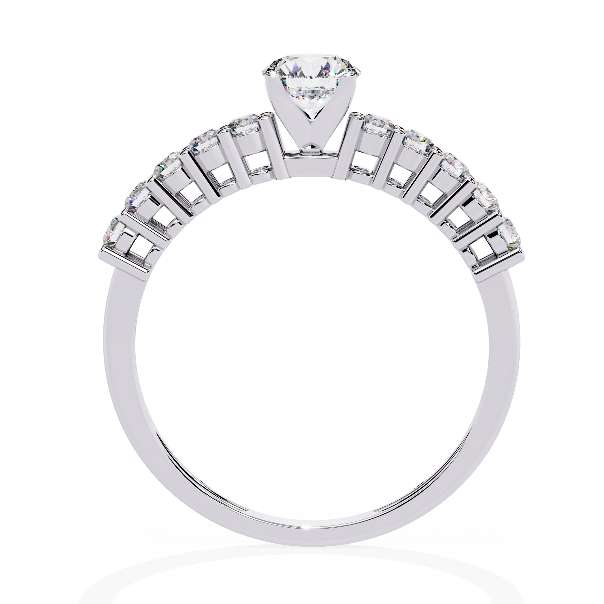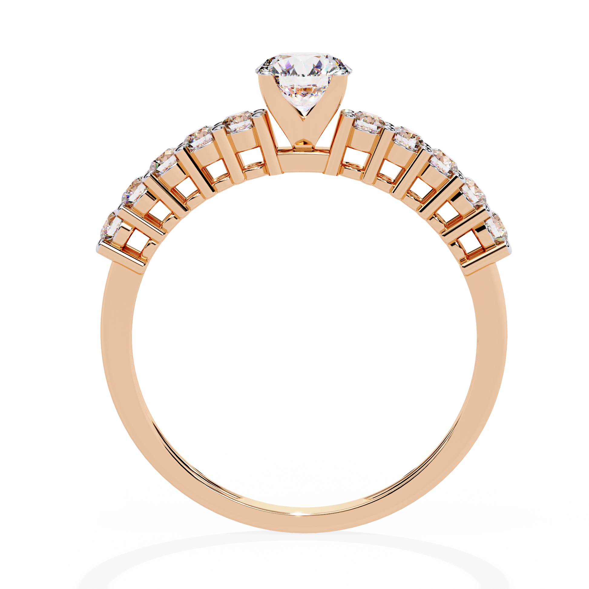 Brilliance Band – A timeless ring featuring a dazzling round center diamond, with small accent diamonds lining the shank to enhance its radiant sparkle. It embodies classic elegance and refined brilliance in every detail. |