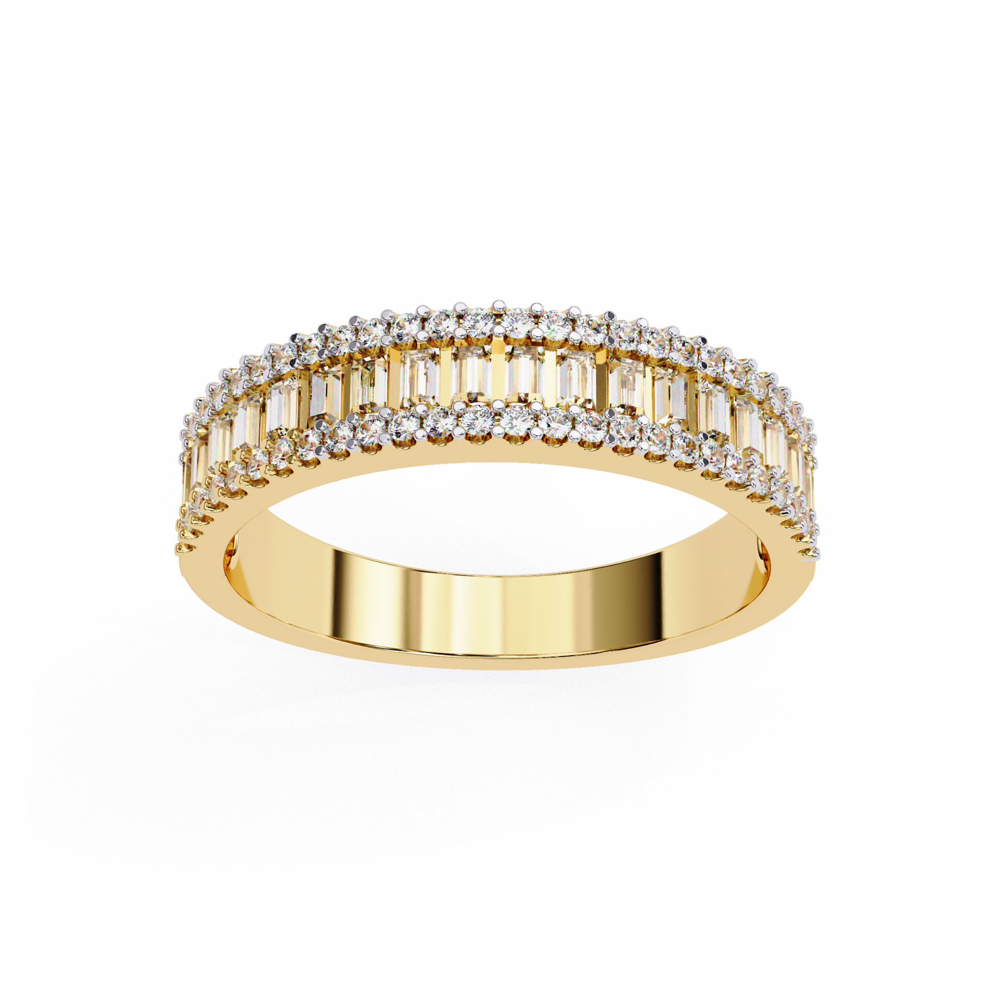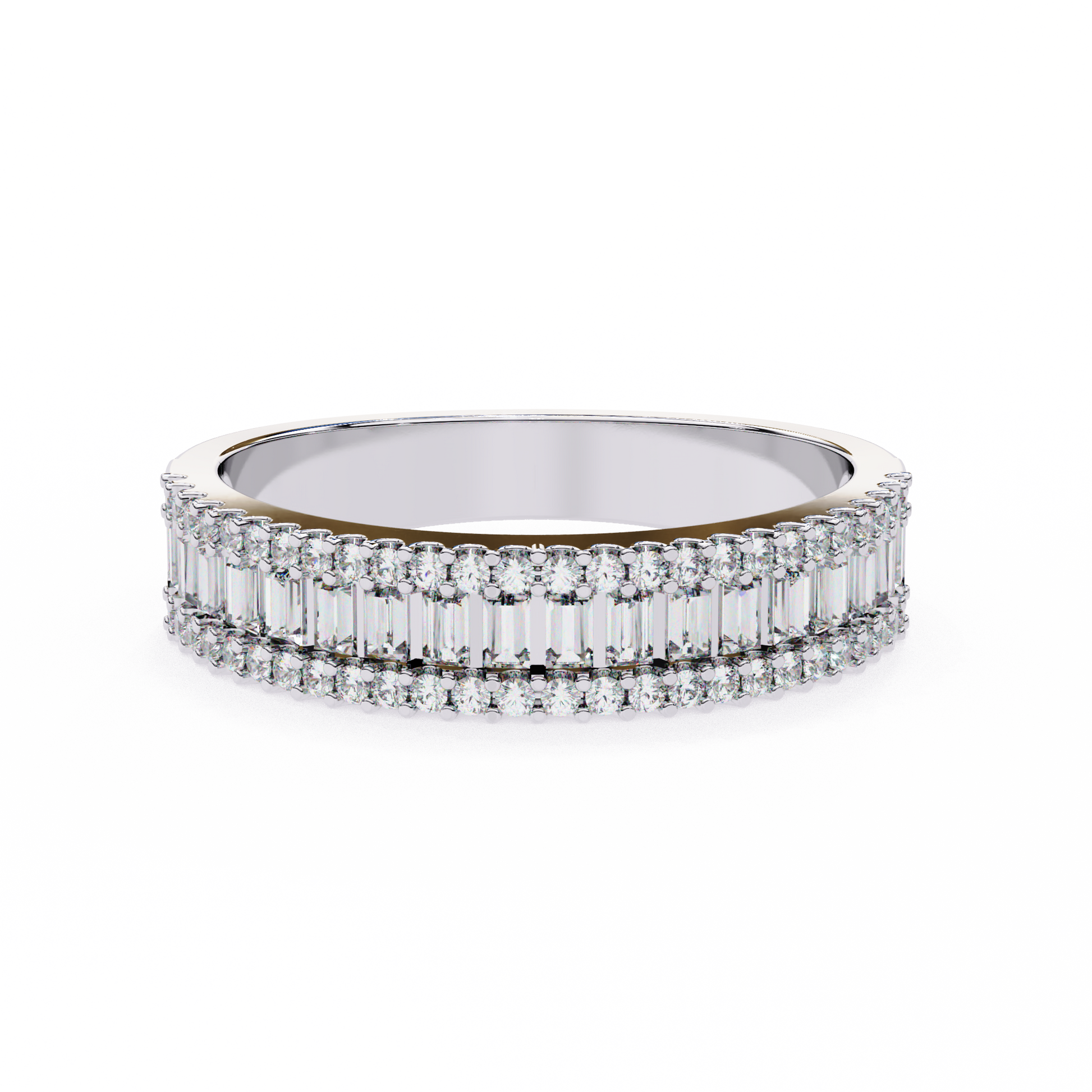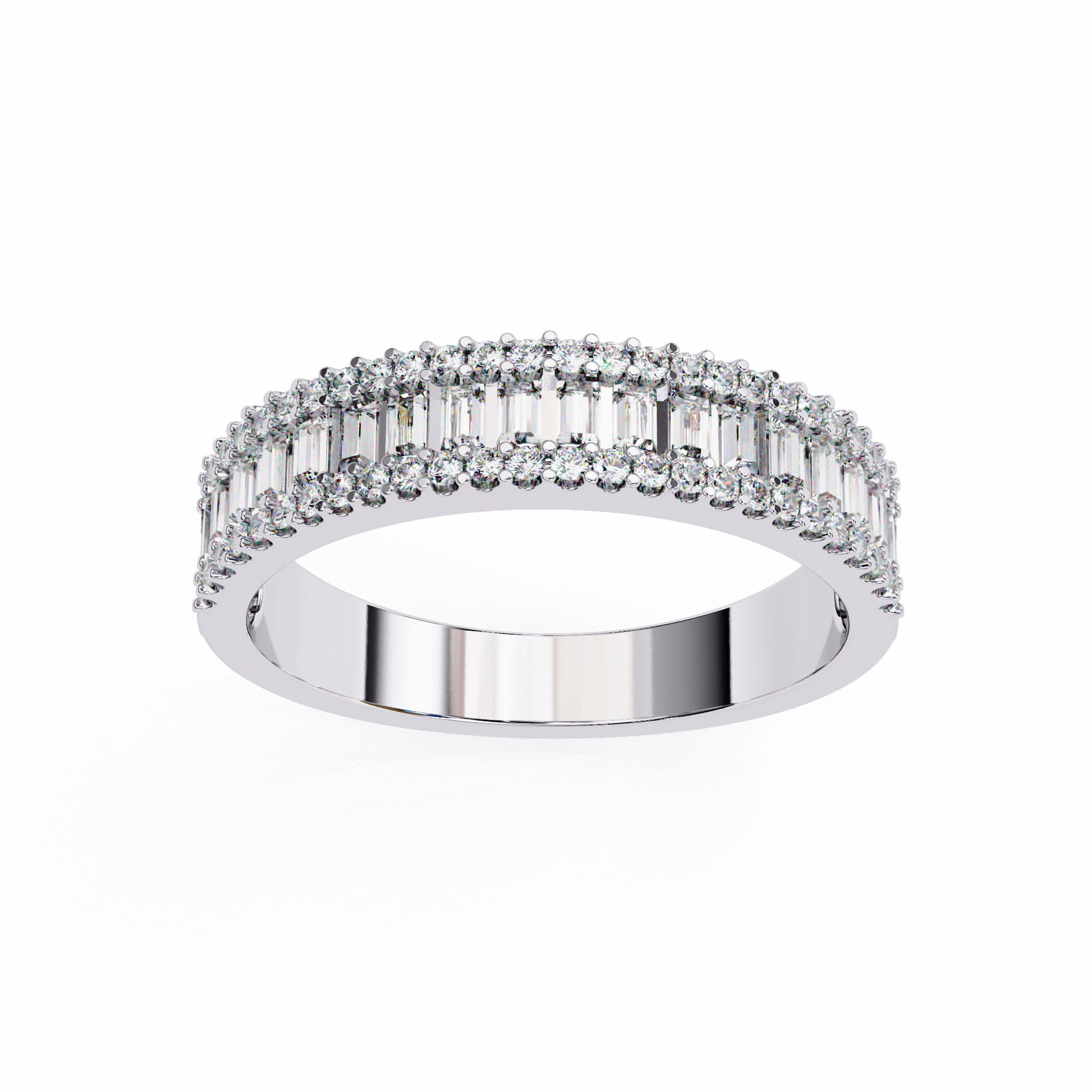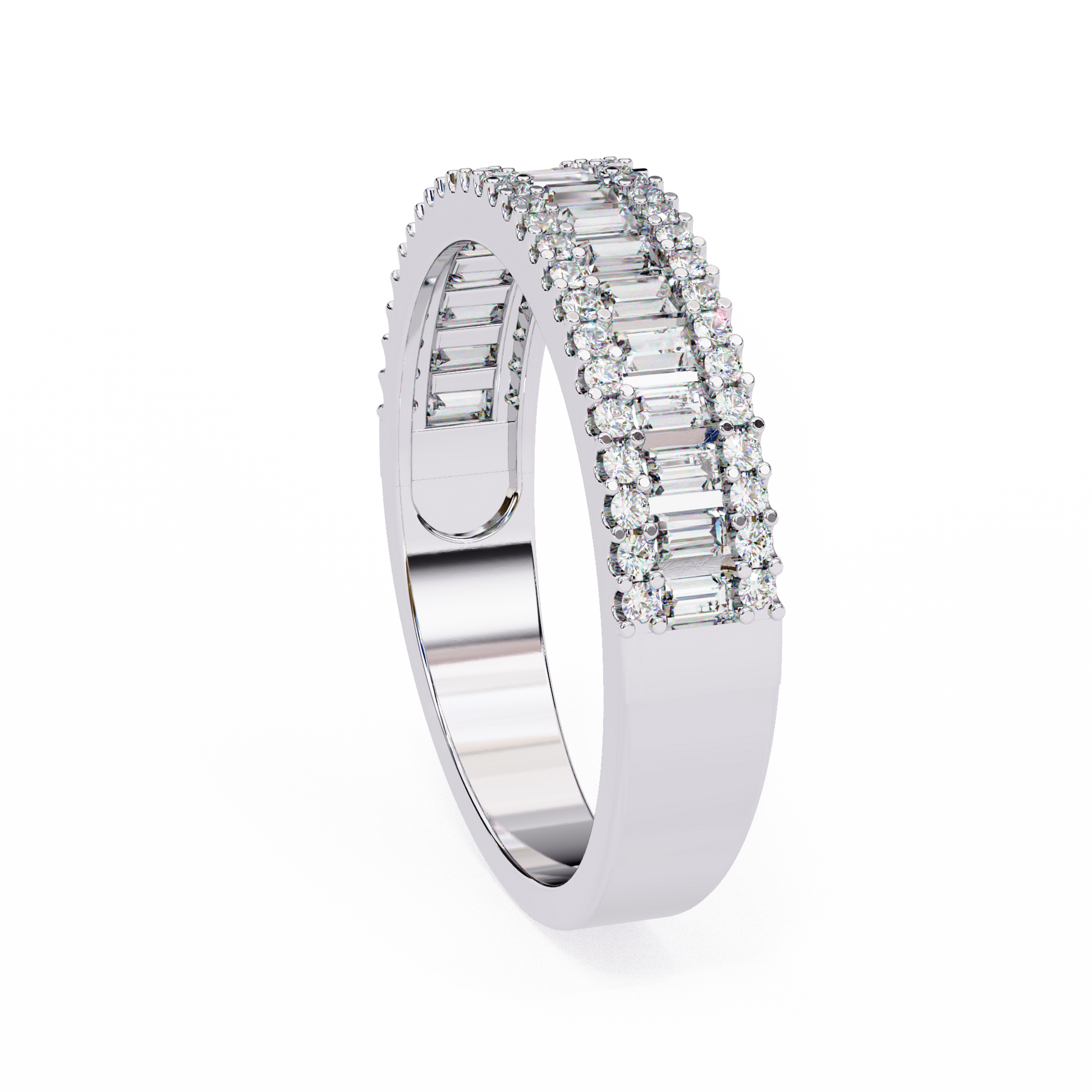"Dual Radiance" captures the harmonious blend of baguette and round diamonds, showcasing two distinct types of brilliance—clean, linear sparkle from baguettes and fiery brilliance from rounds. The name reflects balance, elegance, and radiant contrast. |