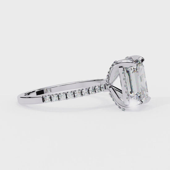 "Gracebeam" captures the refined elegance of an emerald-cut solitaire diamond, known for its clean lines and sophisticated shape, paired with round accent diamonds that add soft, radiant sparkle—like graceful beams of light enhancing timeless beauty. |