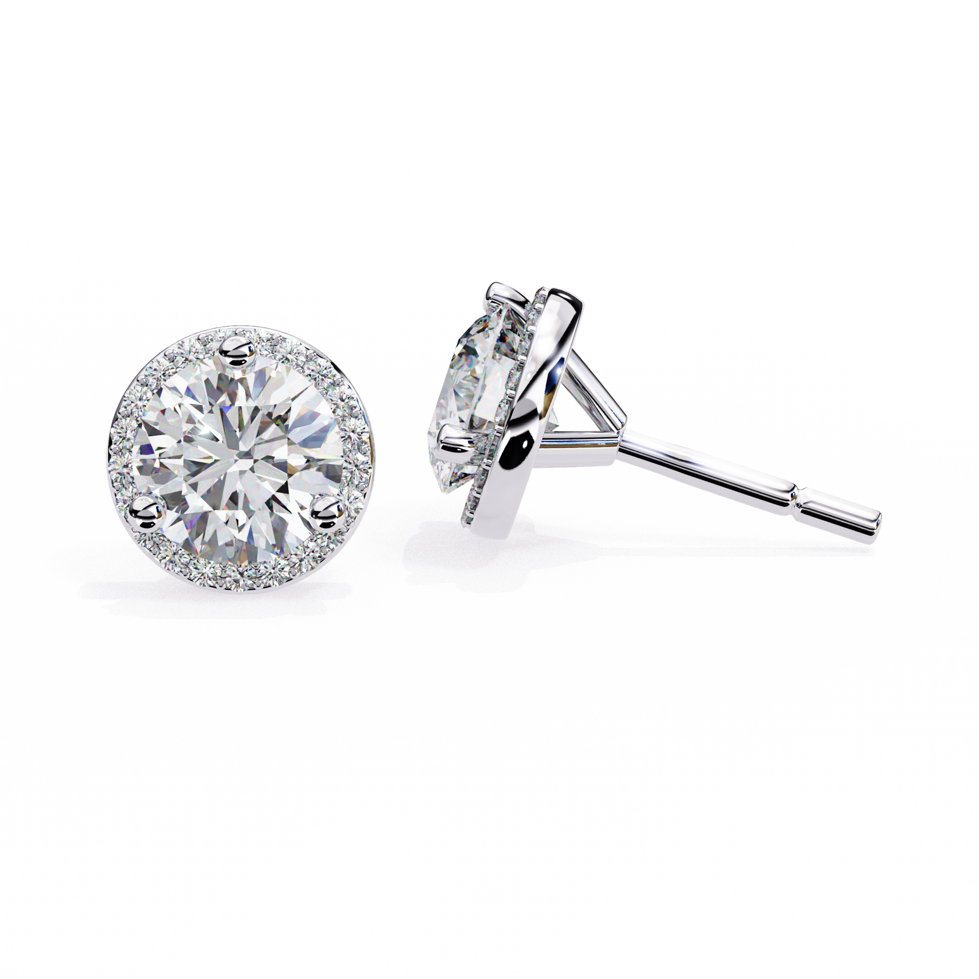 “Halo Solitaire Studs” is a classic and straightforward name that perfectly describes the design—a central solitaire diamond encircled by a halo of smaller accent diamonds. It clearly conveys elegance, brilliance, and timeless style, making it instantly recognizable and appealing to anyone looking for that iconic sparkling look. |