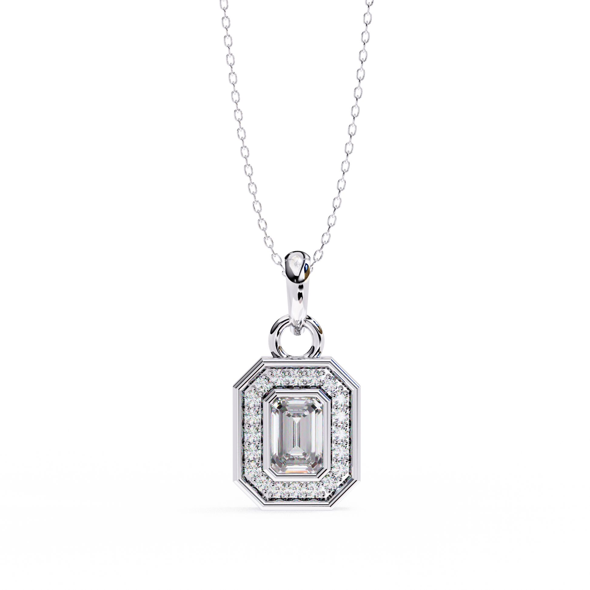 Halomira combines "Halo" (the round diamonds surrounding the center) with "Mira", which means wonder or miracle in Latin and several other languages.It beautifully captures the essence of a halo-style pendant with an emerald-cut center diamond—symbolizing a radiant wonder encircled in brilliance, full of elegance, light, and timeless charm. |