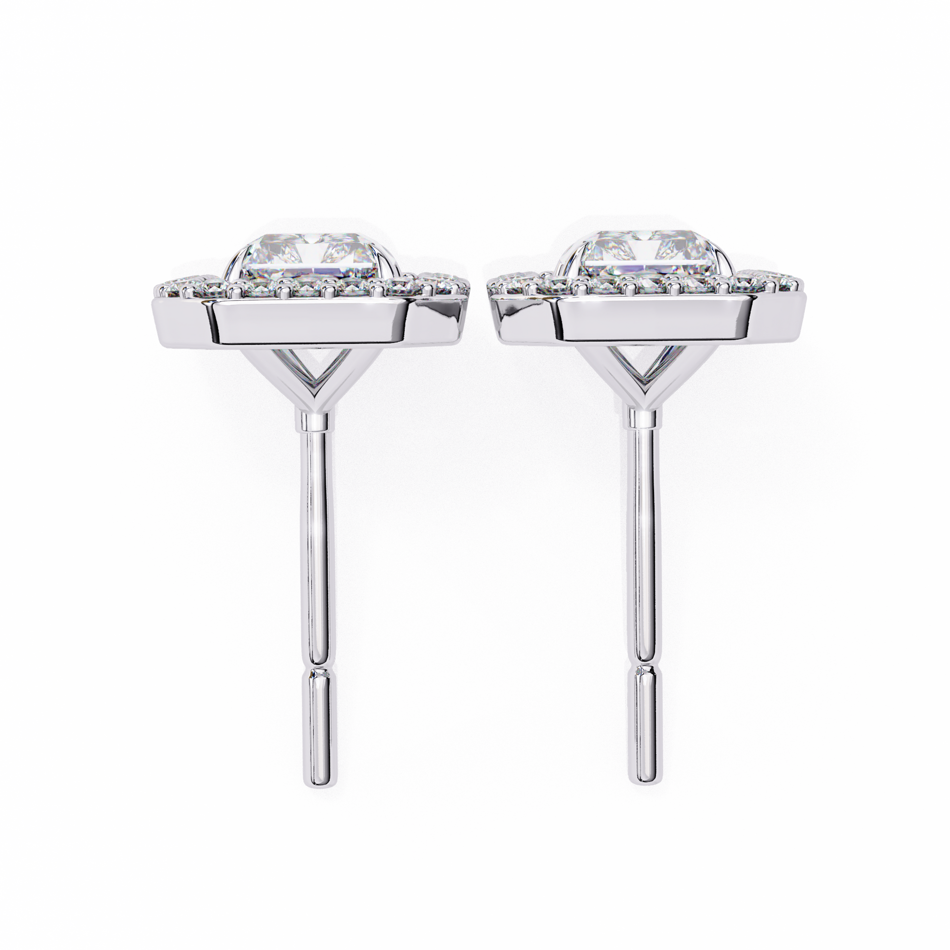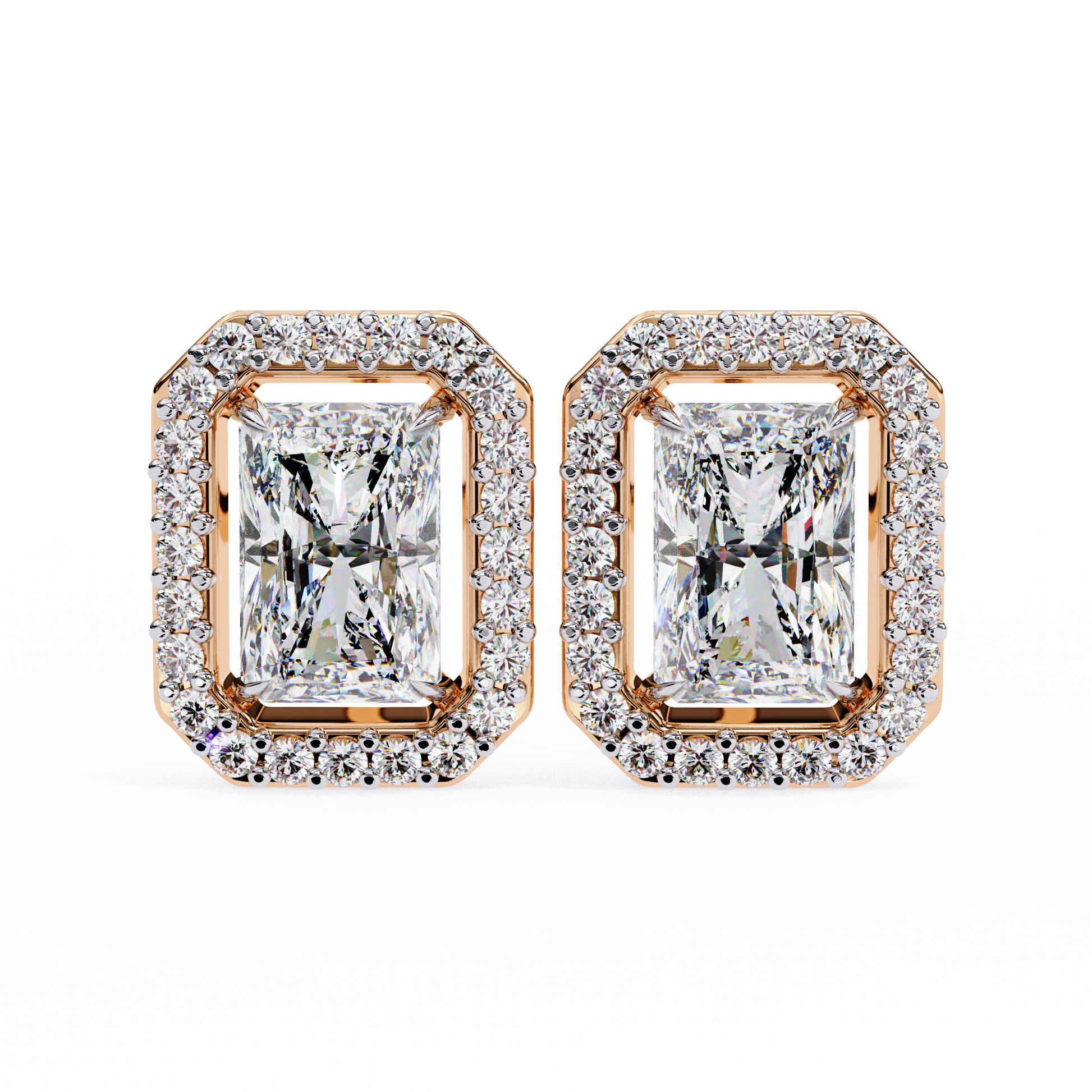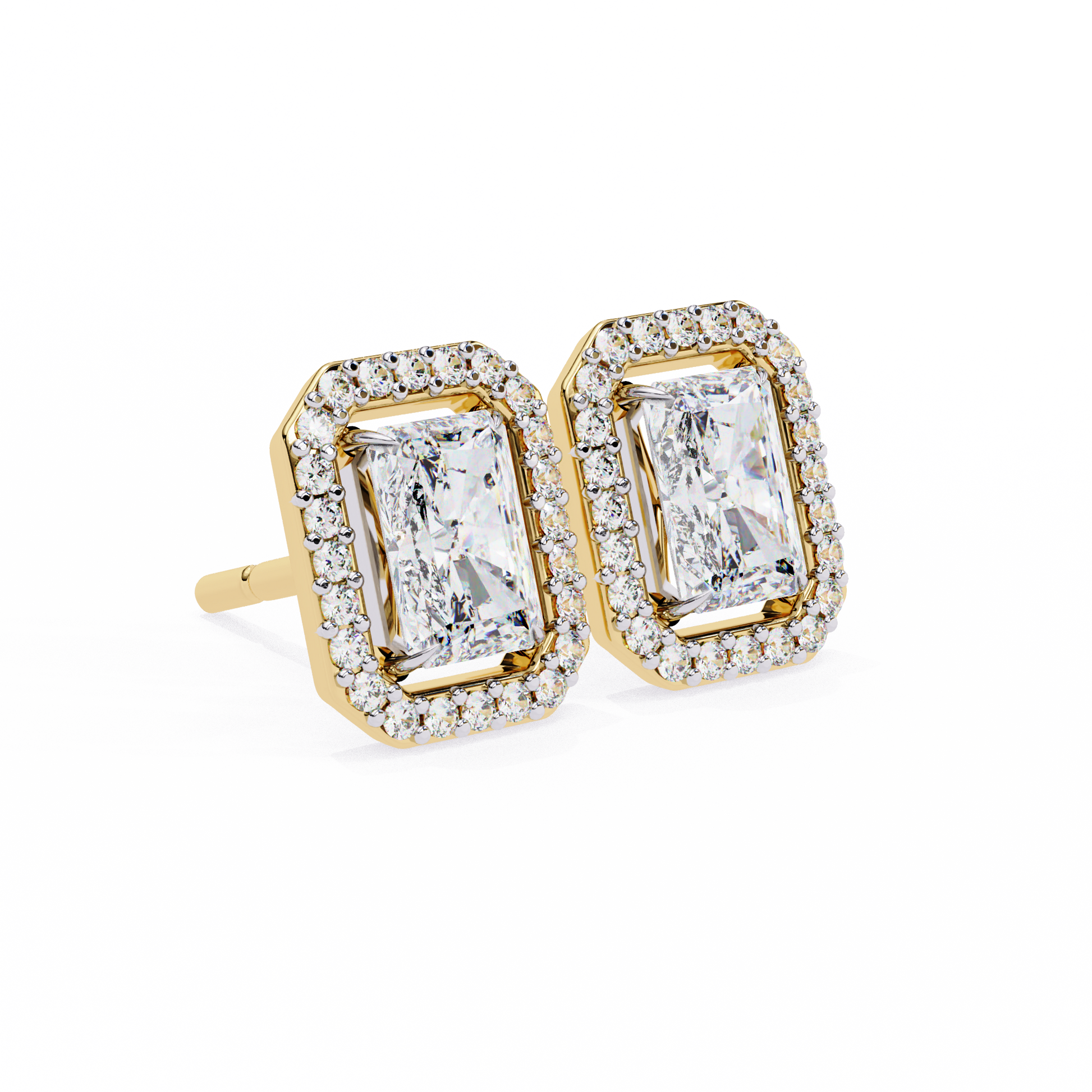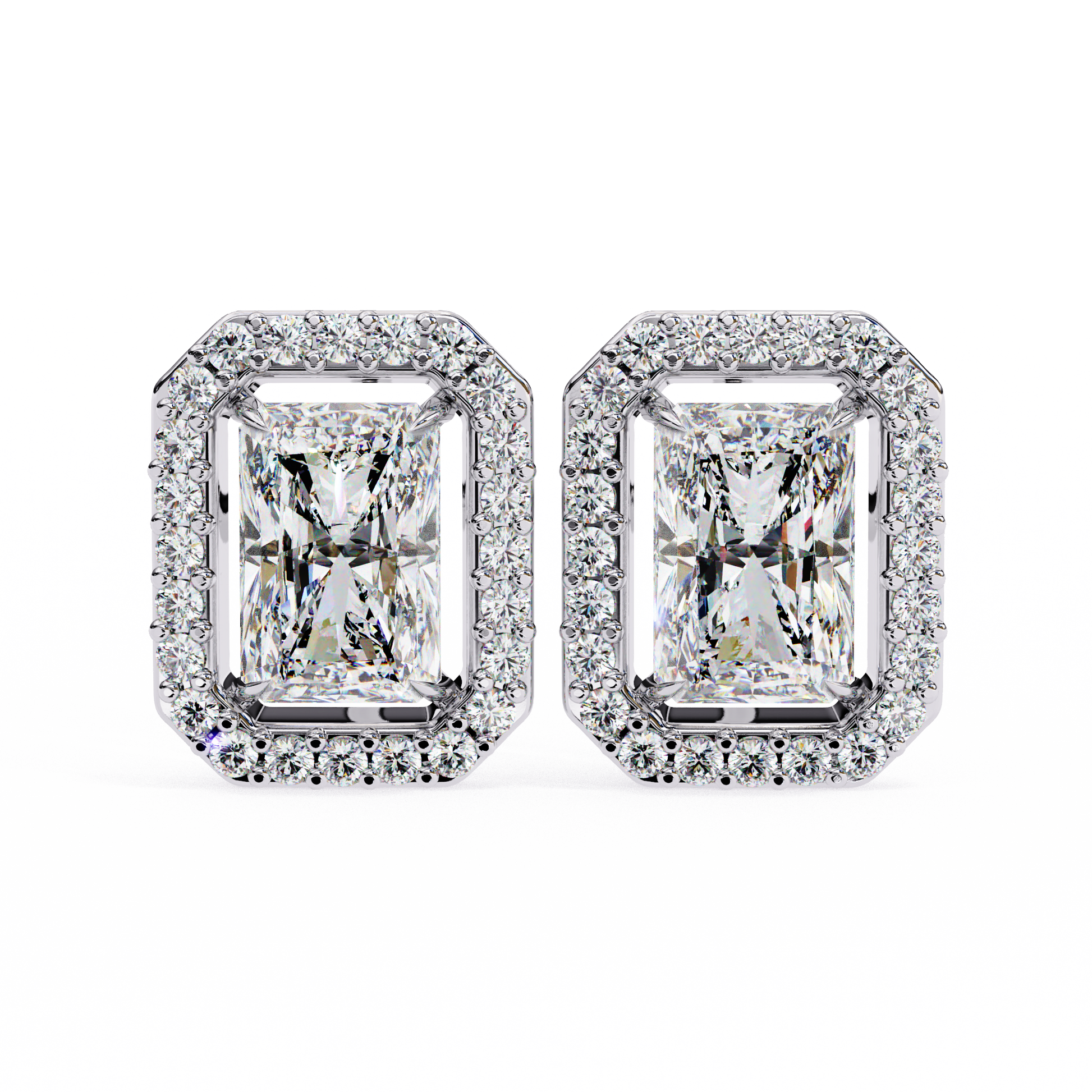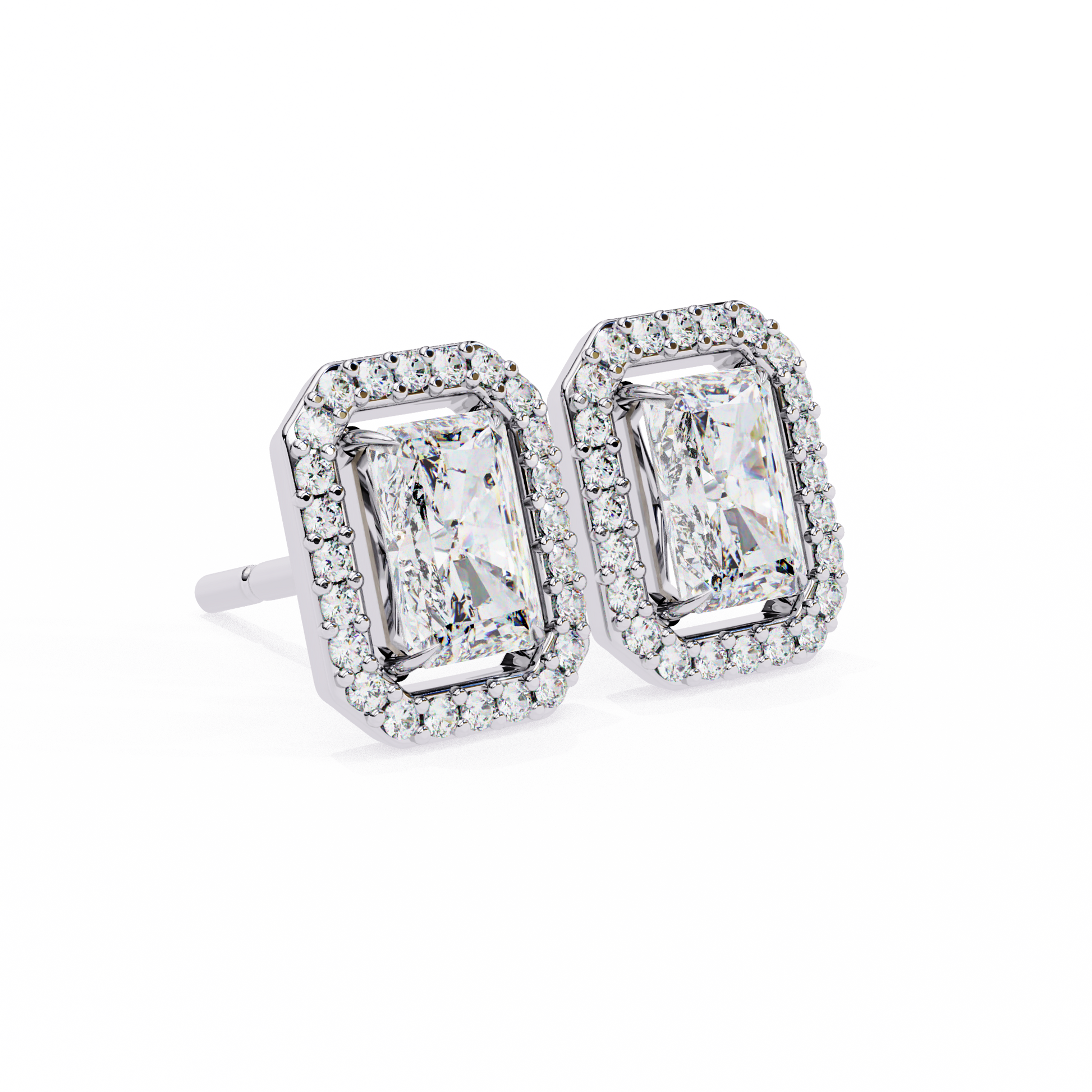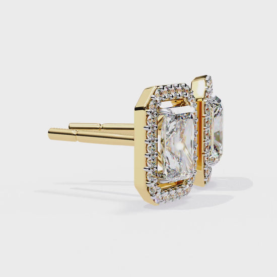 Radiant Halo Studs are stunning earrings featuring a radiant-cut solitaire diamond at the center, beautifully surrounded by a halo of smaller round diamond accents. The name highlights the dazzling central stone and the sparkling “halo” that enhances its brilliance, creating a striking and elegant look. |