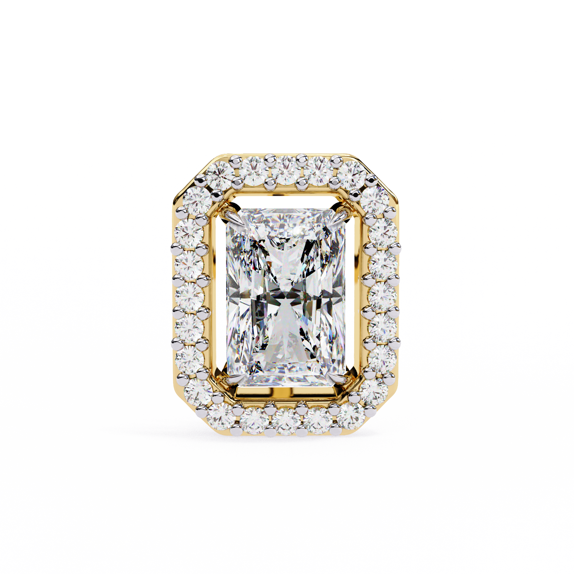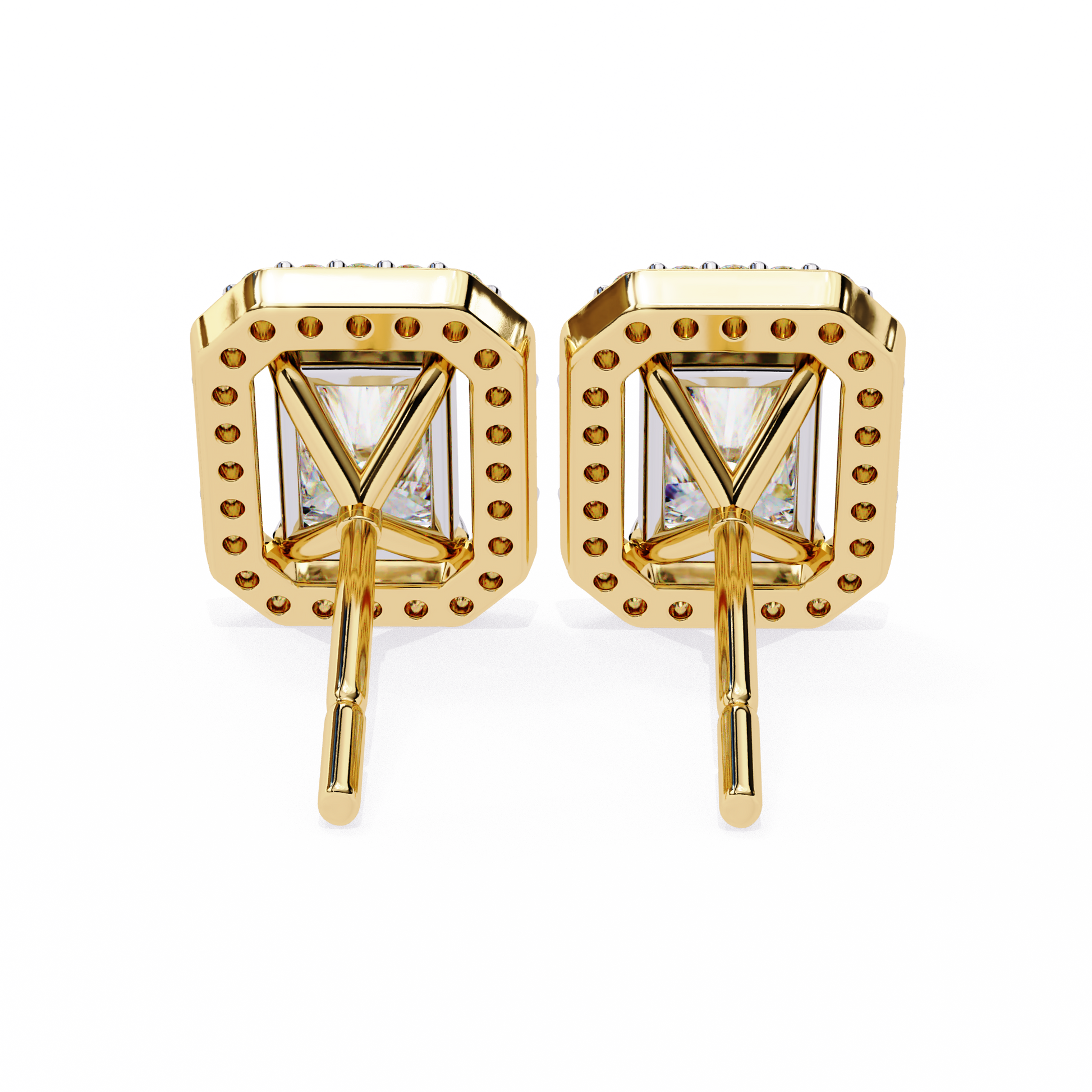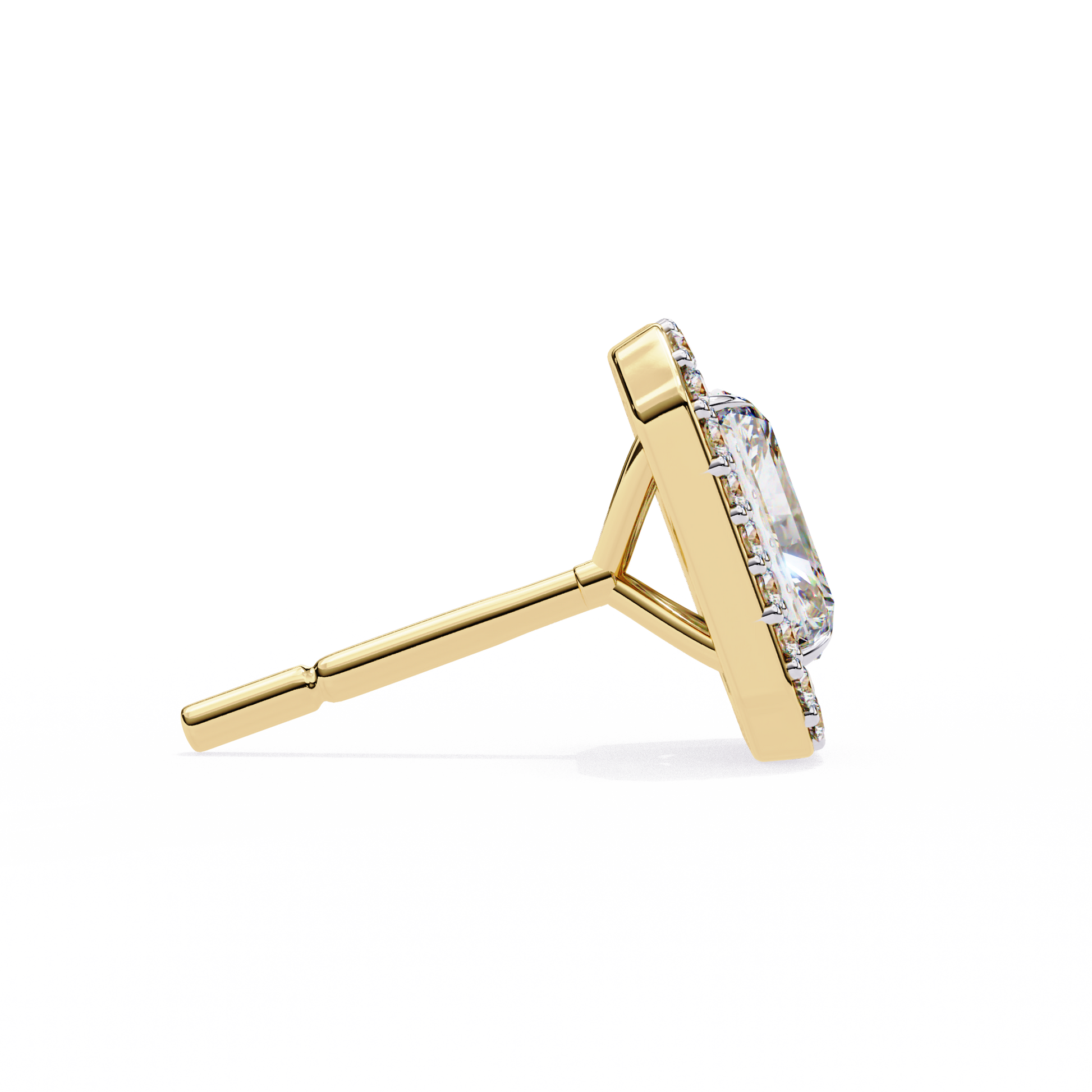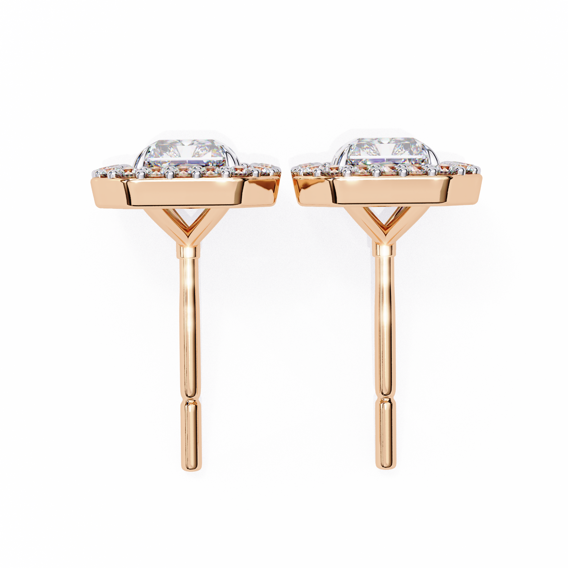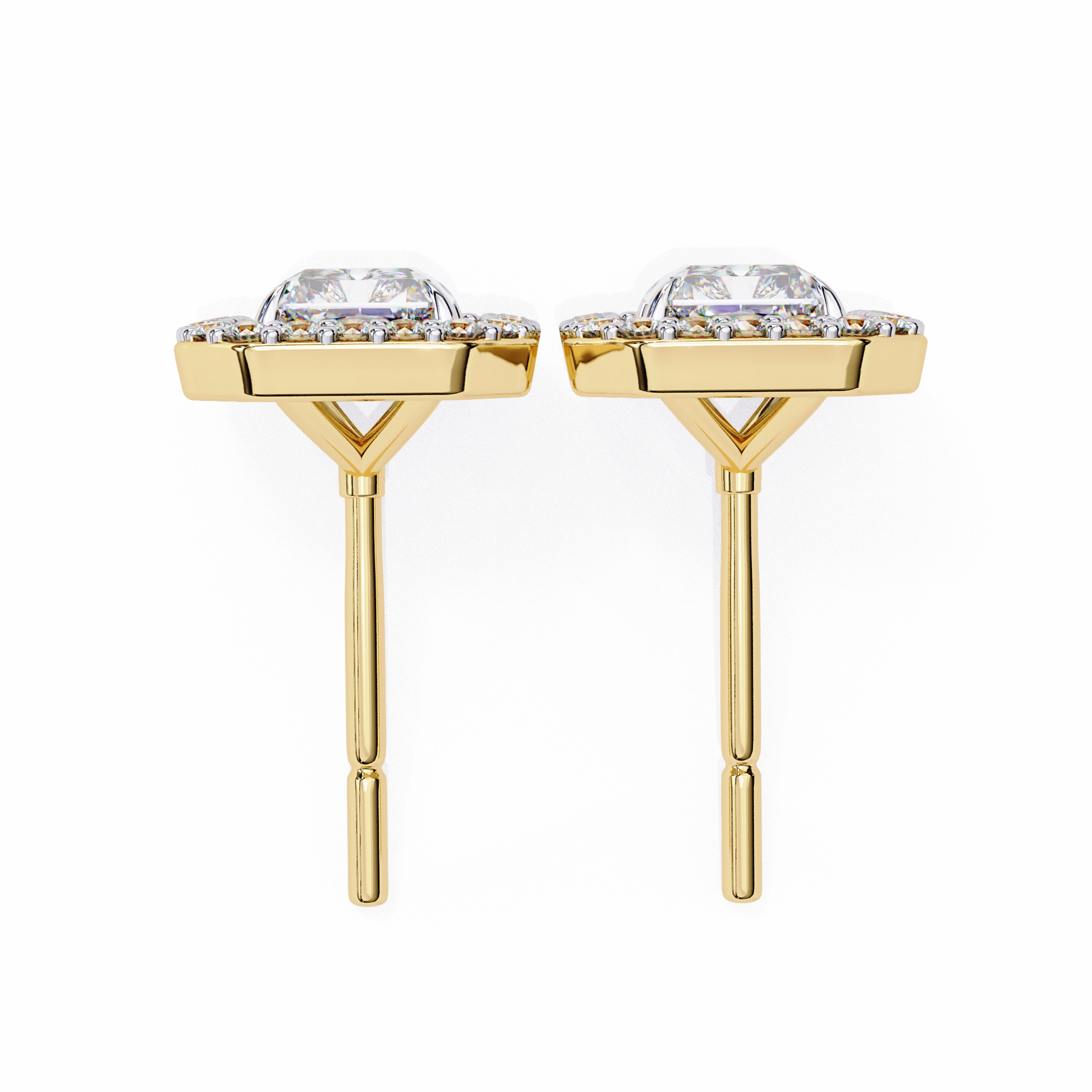 Radiant Halo Studs are stunning earrings featuring a radiant-cut solitaire diamond at the center, beautifully surrounded by a halo of smaller round diamond accents. The name highlights the dazzling central stone and the sparkling “halo” that enhances its brilliance, creating a striking and elegant look. |