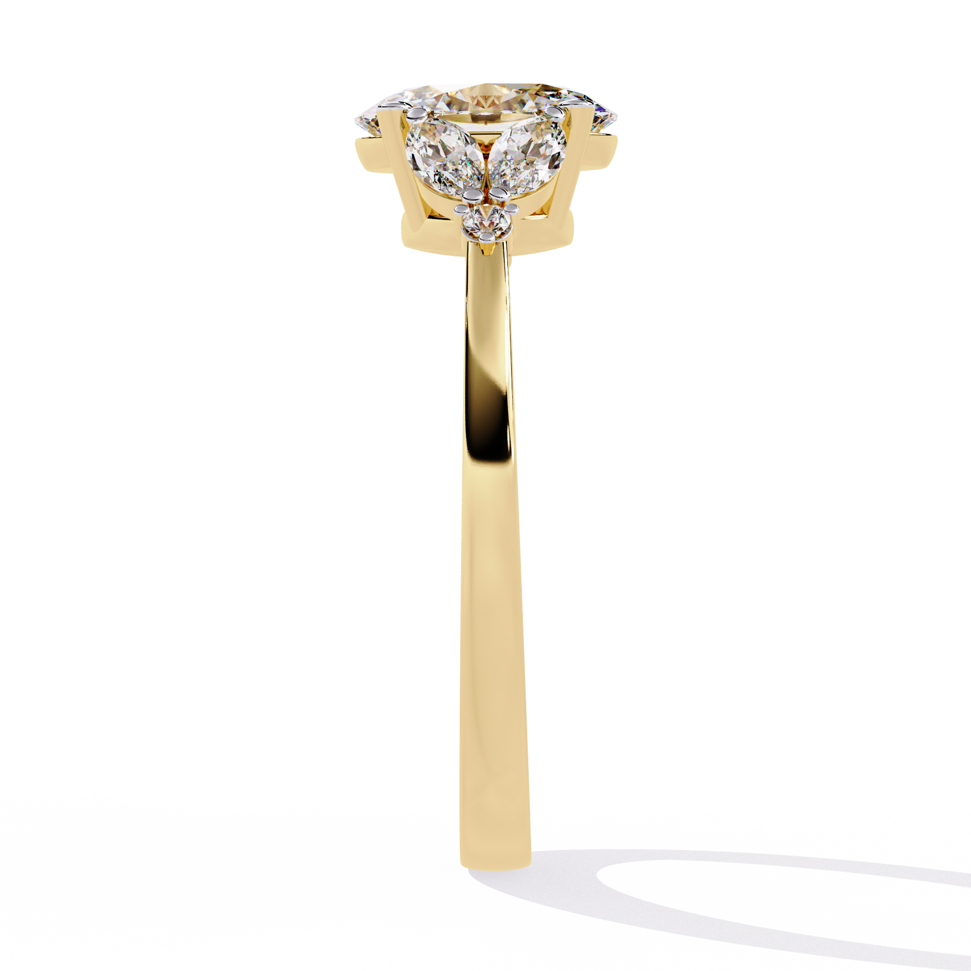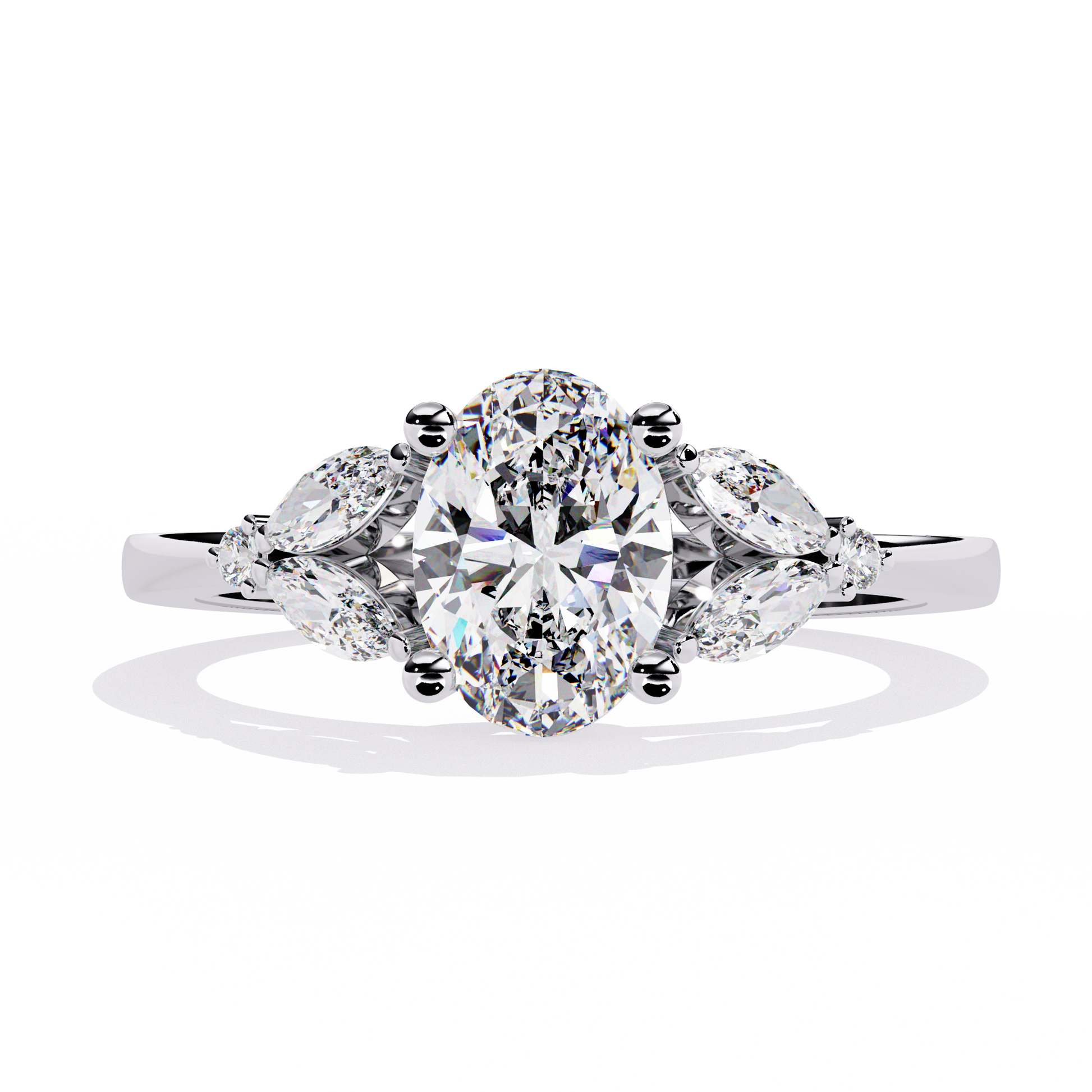 "Royal Plume" evokes the image of a feathered, regal design, where the oval solitaire is gracefully flanked by marquise diamonds that resemble soft, elegant plumes. The name reflects sophistication, nobility, and the light, airy beauty of a royal ornament. |