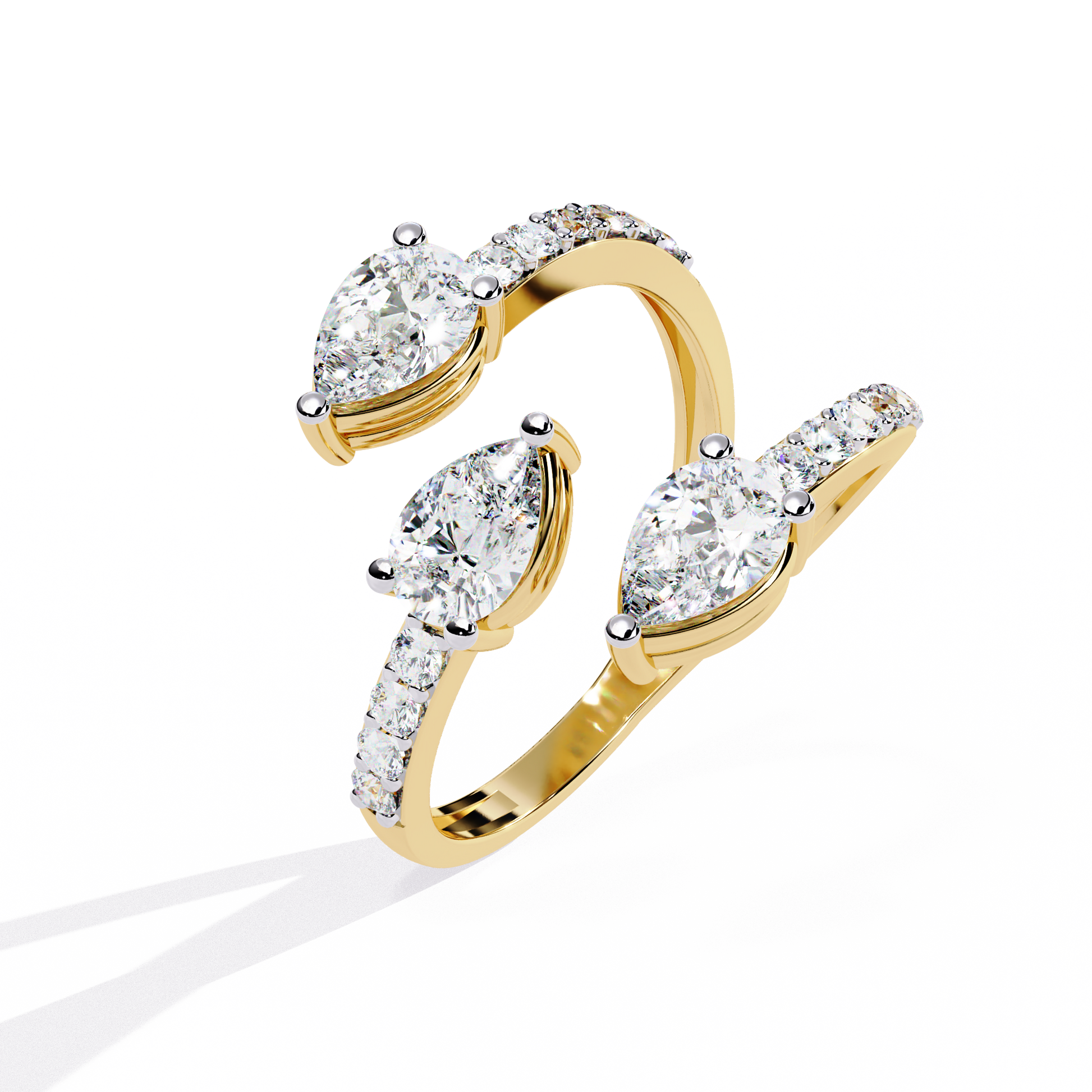 "Trinity Bloom" symbolizes the three pear-shaped diamonds as a harmonious trio, blooming together like petals. The small round accent diamonds enhance their sparkle, giving the ring a radiant, floral-inspired elegance that represents unity, beauty, and growth. |