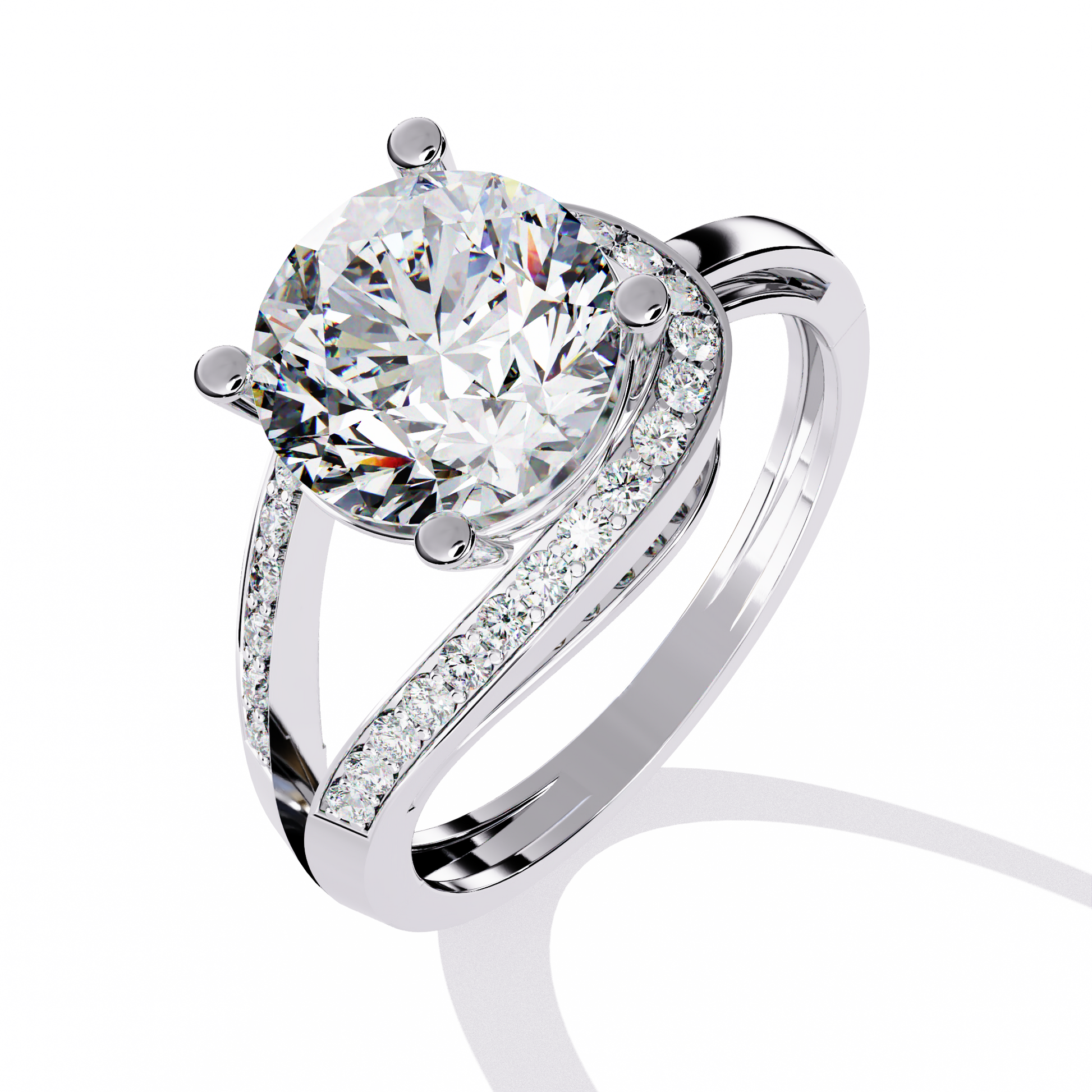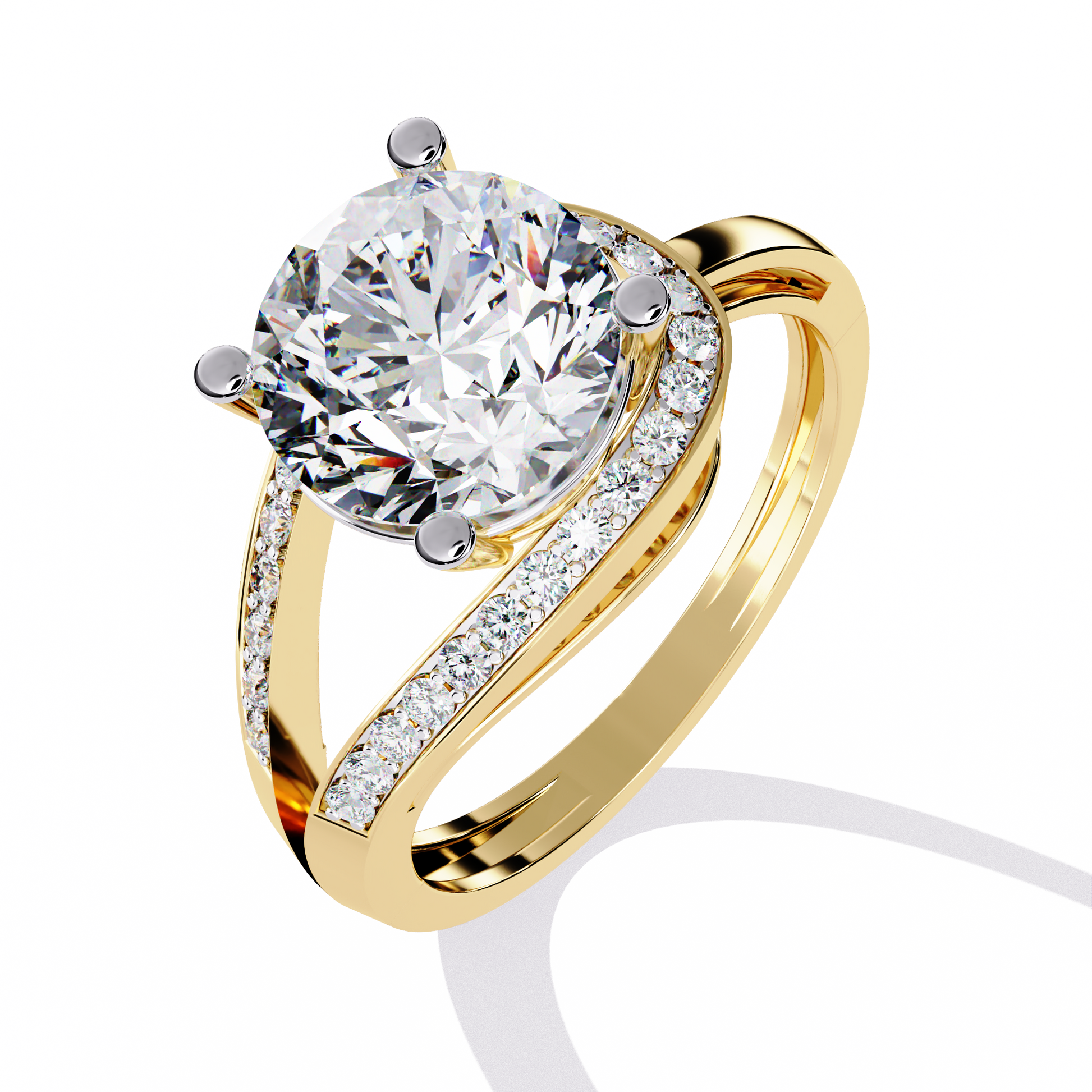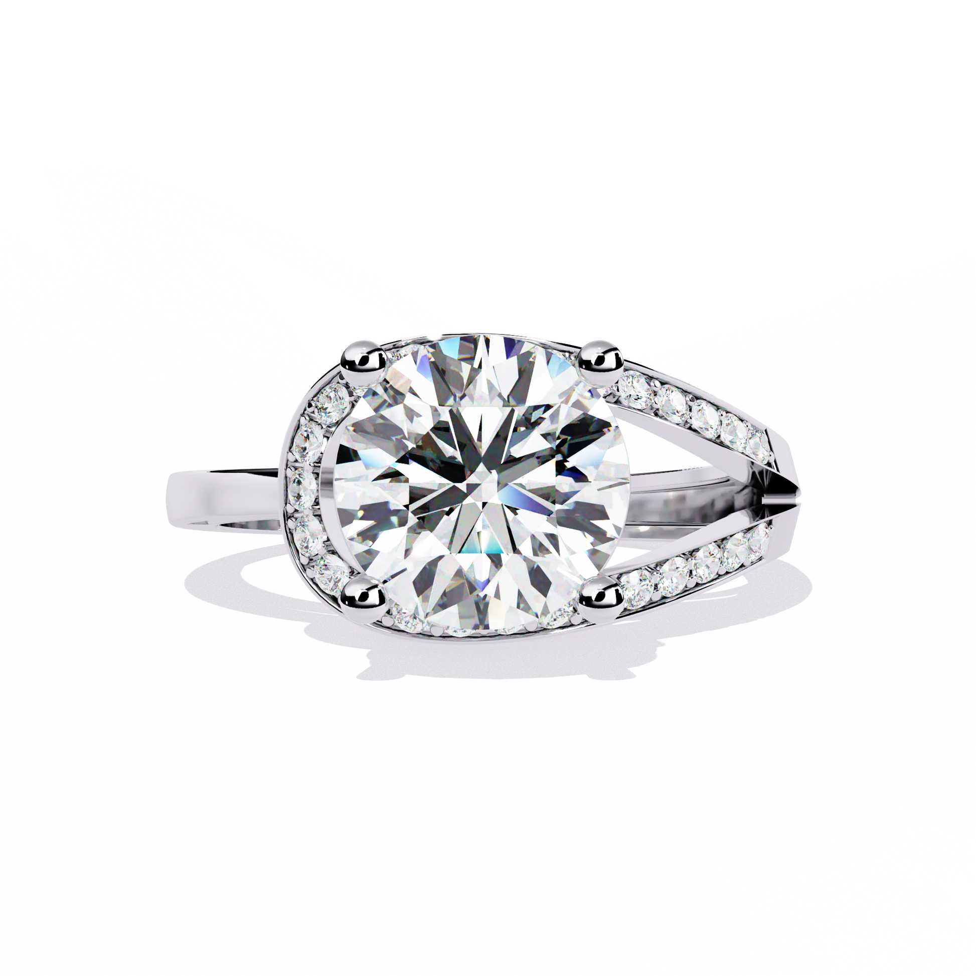Twilight Embrace – A graceful design where the split shank curves around a brilliant round solitaire, like twilight gently wrapping the last light of day. The accent diamonds along the band enhance the soft, radiant glow. |