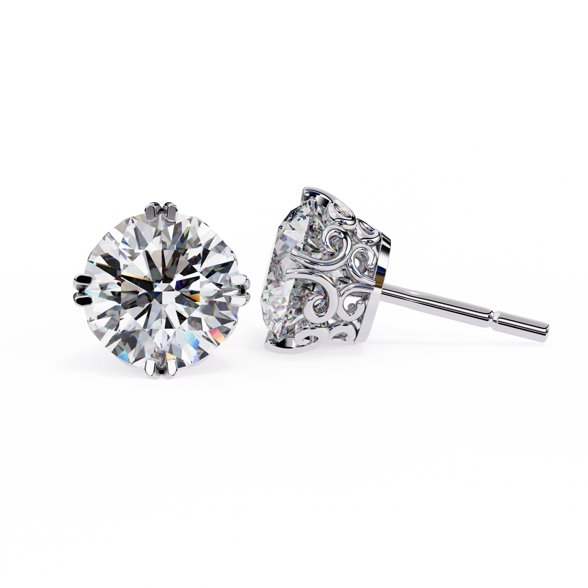 Victorian Bloom Studs are round solitaire earrings featuring prongs inspired by Victorian-era floral motifs. The name evokes vintage elegance and intricate craftsmanship, like a blossoming flower embracing the diamond. |