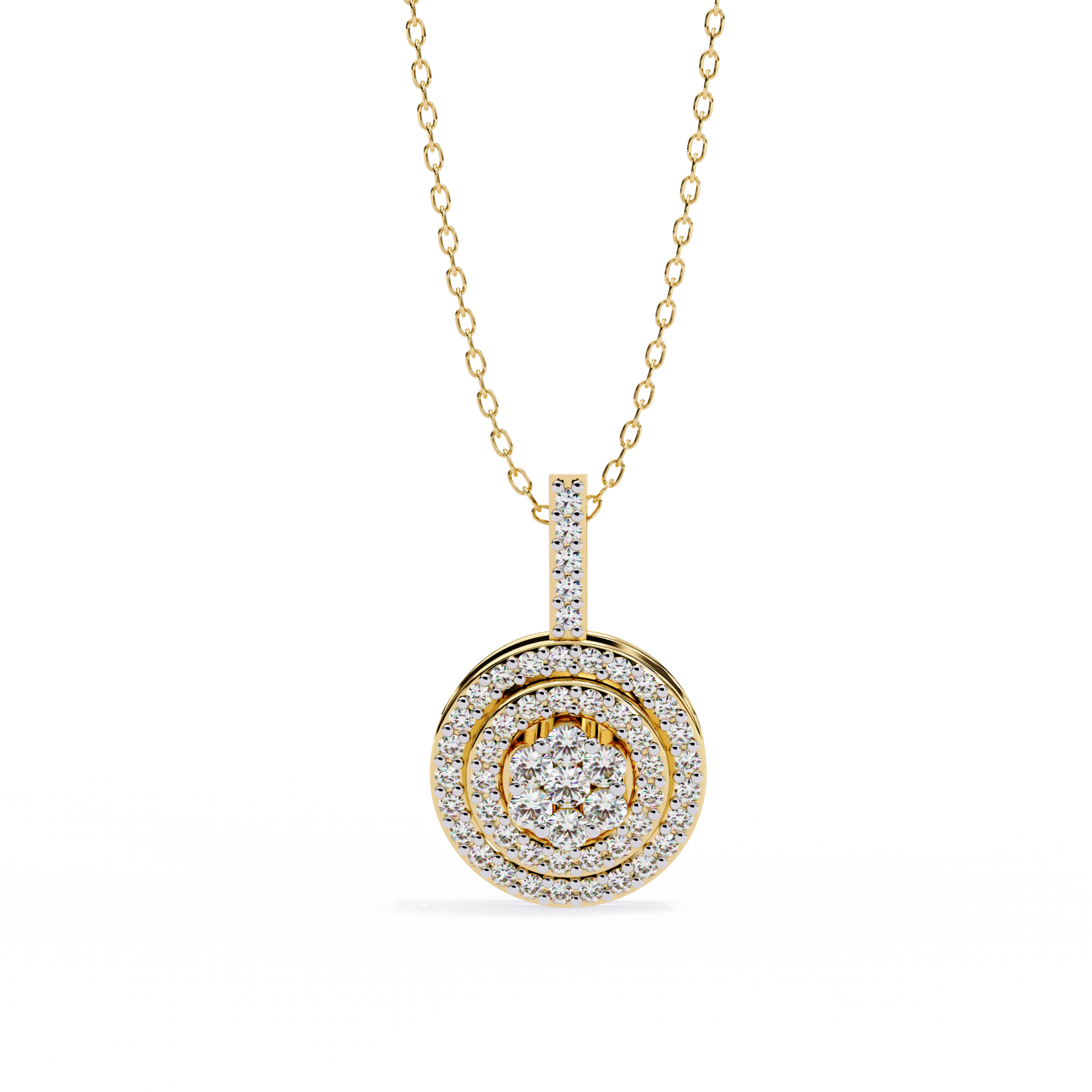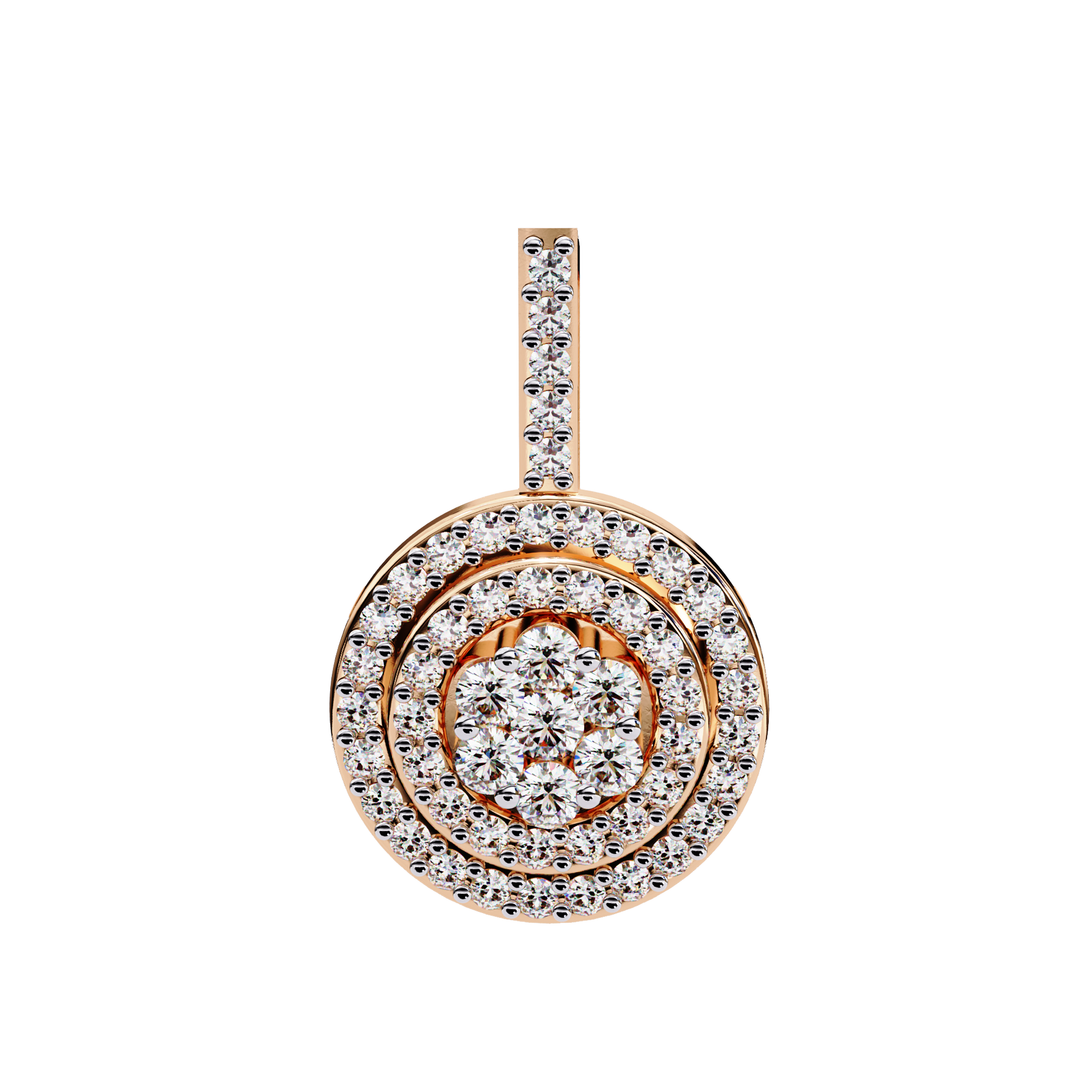 Vistara is inspired by "Vista" (a clear, expansive view) combined with a hint of "Tiara", giving the name a sense of radiant beauty and regal elegance.Perfect for a round cluster diamond pendant in halo style, it evokes the image of a brilliant, crown-like sparkle that draws every eye—graceful, majestic, and luminous.